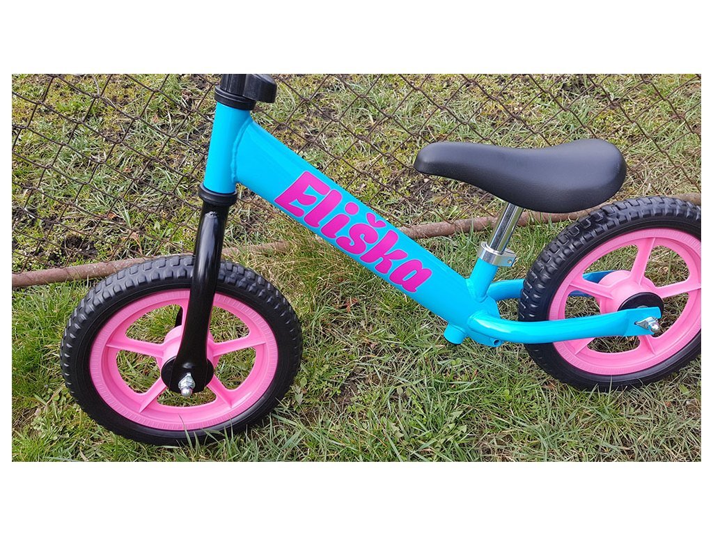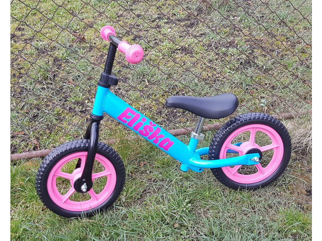 Ultraľahké odrážadlo s menom - tyrkysové s ružovými kolesami