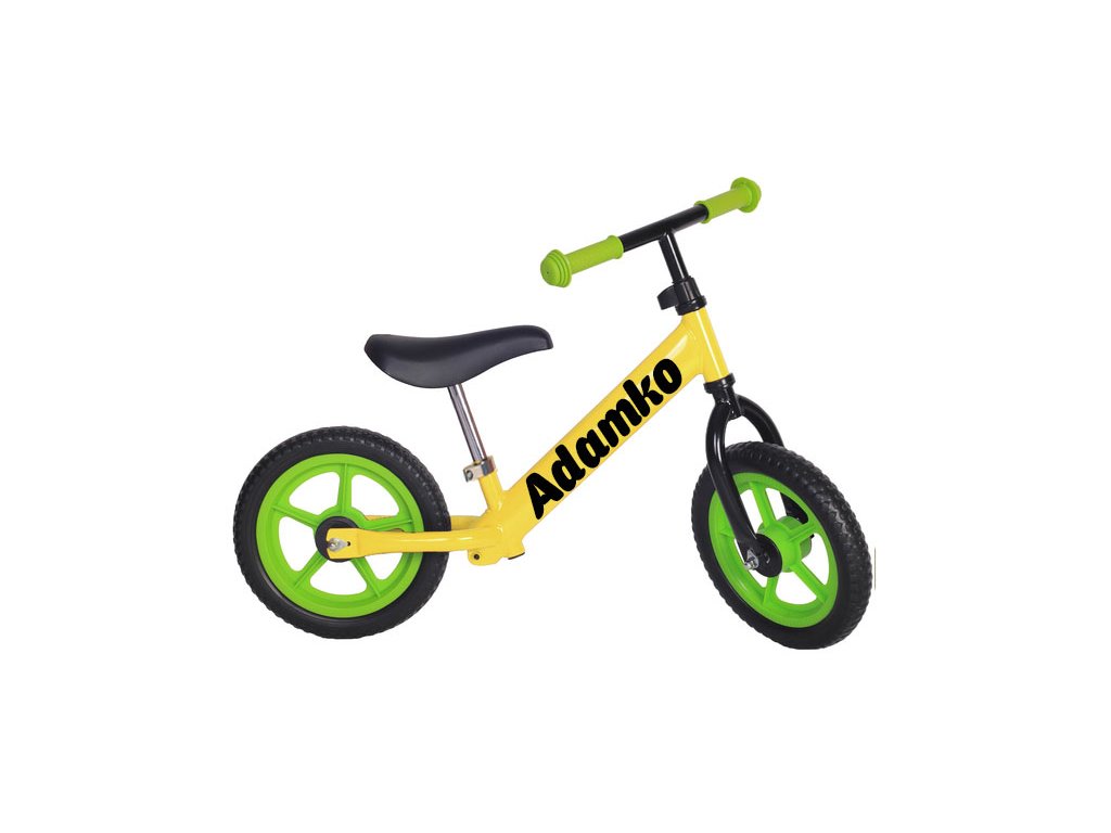 Moje odrážadlo s menom - žlté so zelenými kolesami