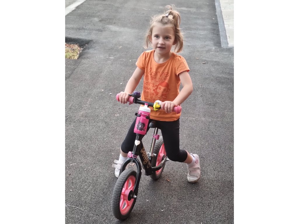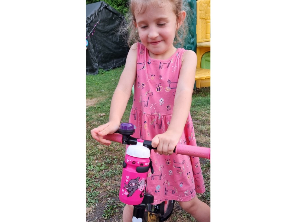 350 ml detská športová fľaša s držiakom na odrážadlo. Dá sa upevniť na prednú vidlicu odrážadla spredu alebo zozadu, pasuje aj na bicykel.